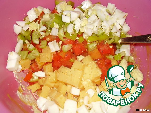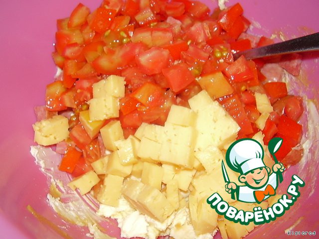 помидор и твердый сыр также нарезать кубиками и добавить к общей массе