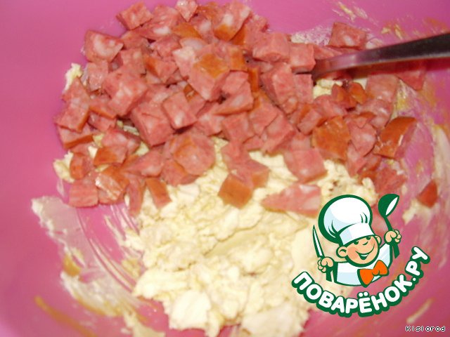 наполнить батон подготовленной начинкой, завернуть в пленку и положить в холодильник на 40 минут