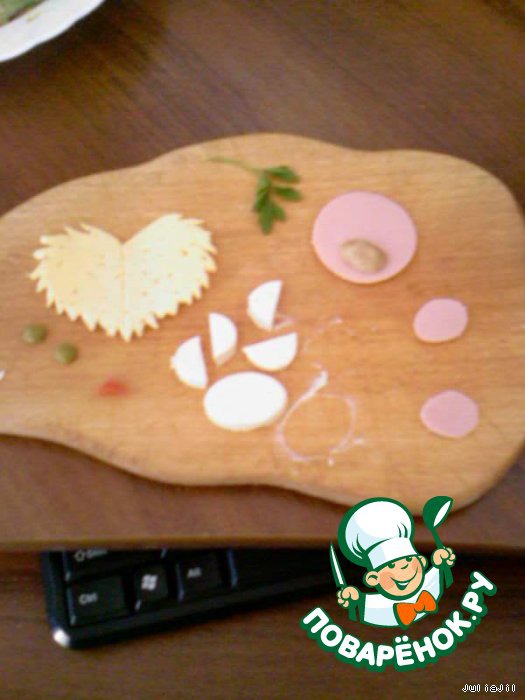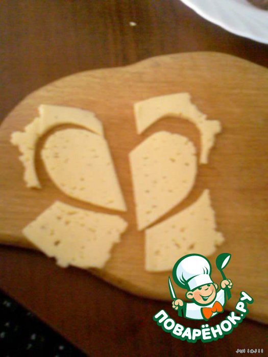 Из сыра вырезаем два полусердечка - грива (если у вас большой ломтик сыра, то можно вырезать сразу сердечко)