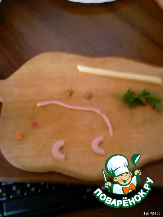 Из колбасы вырезаем тоненькую длинную полосочку (по кругу колбасы) - хвостик, вырезаем кружочек и прорезаем его в сeредине - ушки, маленький треугольничек из помидора - ротик, такой же треугольник из моркови - носик, горошек разрезаем пополам - глазки, листочек петрушки - чубик, сама веточка от петрушки - перепоночка между ротиком и носиком, вырезаем полосочку из сыра - ветка, на которой висит мартышка (можно заменить соломкой).