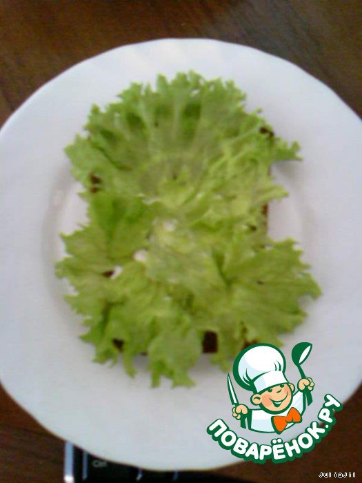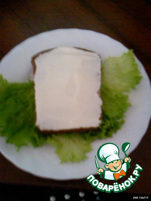 На тарелочку выкладываем два листика салата и сверху ломтик хлеба, смазанного майонезом.