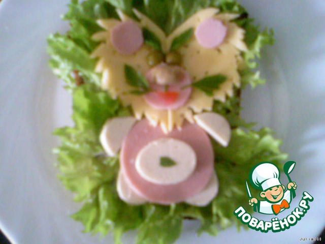 По бокам вырезанного сыра делаем надрезики, чтобы грива выглядела эффектнее. Из плавленного сырка вырезаем три кружочка, два из них разрезаем пополам - лапки и пузико, горошек пополам - глазки, из колбасы вырезаем круг - туловище, два маленьких кружочка - ушки, от шапочки грибочка отрезаем боковушку - носик, из маленького кусочка помидора вырезаем треугольник - ротик, листики петрушки - бровки и усики (можно на усики взять укроп).