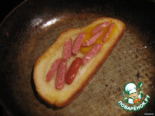 Корочка обжарилась, разбиваем внутрь яйцо! Солим, можно поперчить, это по вкусу уже.