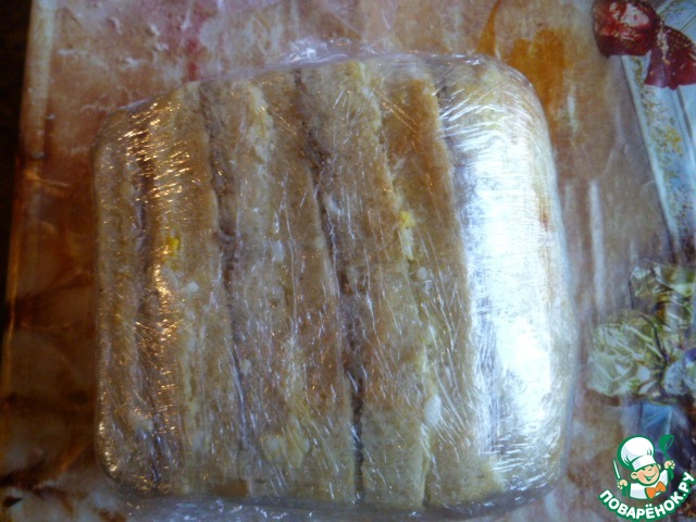 Плотно заворачиваем в пищевую пленку и кладем в холодильник на 5 часом, я положила на ночь.