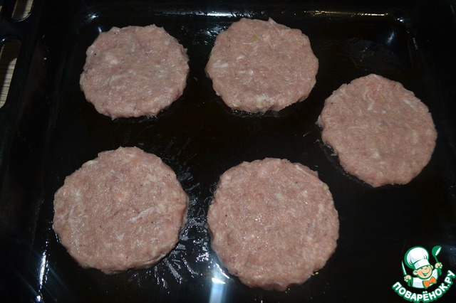 В фарш добавляем мелко нарезанный лук, яйцо, соль и перец по вкусу и перемешиваем. Формируем из фарша плоские кружки, выкладываем на смазанный маслом противень и жарим при температуре 200 гр до готовности