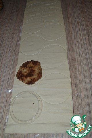 Готовое слоеное покупное тесто раскладываем (я не раскатывала) и вырезаем необходимое количество кружков (по два на котлетку) диаметром чуть больше самой котлетки (я крышкой от сметаны намечала)
