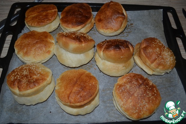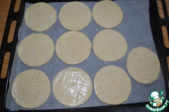 Выкладываем кружки на противень и смазываем молоком или желтком. Половину кружков, которые станут верхушками чизбургеров, посыпаем тмином или кунжутом – как вам по душе.