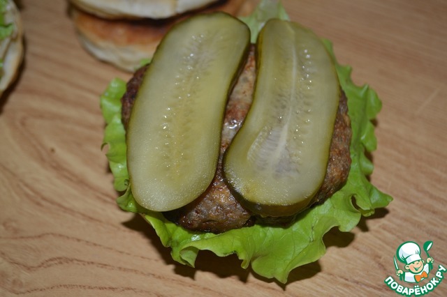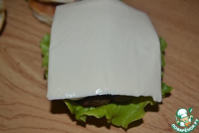 Начинаем собирать чизбургер. Обе половинки смазываем майонезом и кетчупом (по желанию), выкладываем на них листья салата.