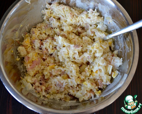 Заправить все майонезом, посолить и поперчить по вкусу и перемешать. Начинка готова.