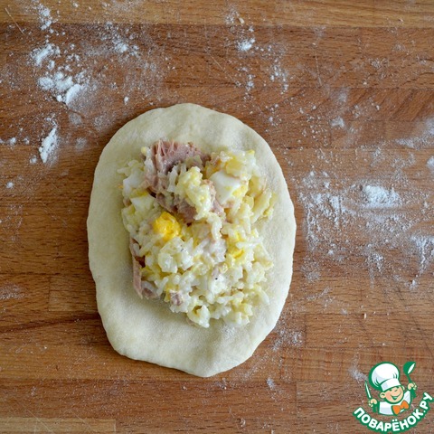 Каждый кусочек теста раскатать в лепешку и выложить на него столовую ложку начинки.