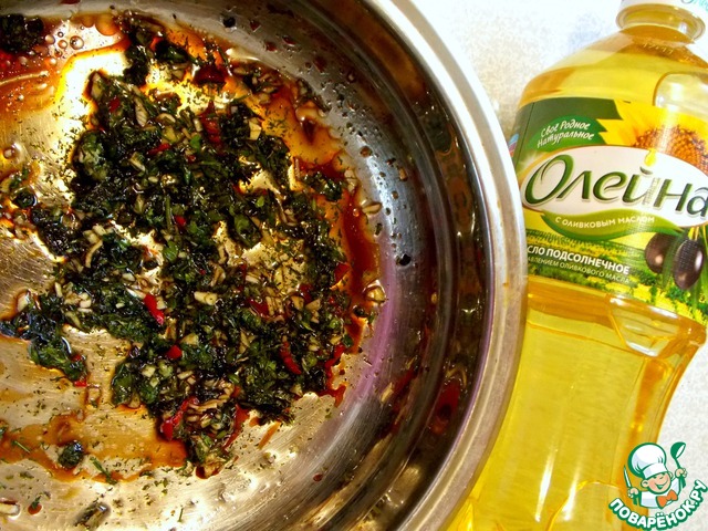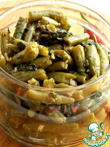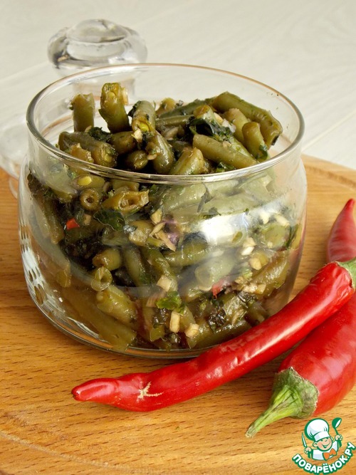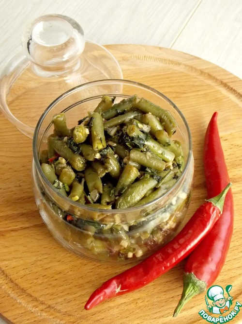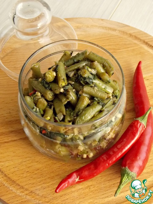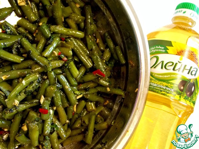 Я брала замороженную фасоль, её надо отварить в солёной кипящей воде 6 мин. Дать остыть. Пока она остывает делаем маринад. Для этого смешать мелко резанные чеснок, чили и кинзу (можно заменить любой другой зеленью на Ваш вкус). Добавляем масло "Олейна", соевый соус, уксус (если таких нет, то замените на яблочный ), сахар и перемешиваем.