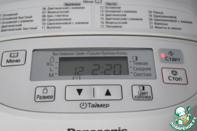 Выбираем режим "Основное тесто" (у меня это 2ч. 20 мин.) и нажимаем кнопку "Старт".