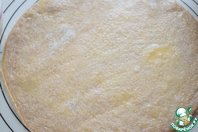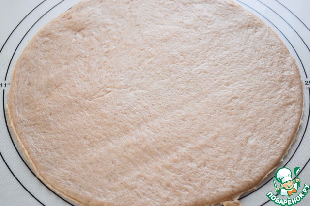 Из слоеного теста (у меня 2 кусочка по 250 г каждый), раскатаем пласт и вырежем круг Ø 25-26 см.