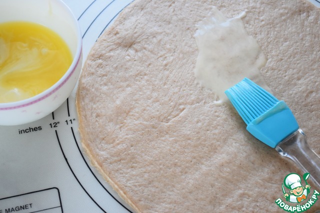 На круг шоколадного теста положить круг слоеного теста, разрезать тесто на 8 сегментов. В середине основания каждого треугольника тоже сделать надрезы длиной около 1-1,5 см.
