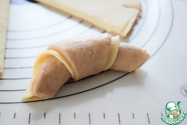 Свернуть рогалики (можно половину свернуть шоколадным тестом внутрь, а половину - наружу).