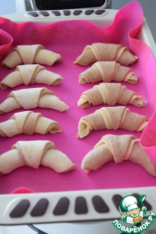 Выкладываем рогалики на противень, застеленный пекарской бумагой или силиконовым ковриком. Убираем в теплое место на 40 минут, накрыв противни полотенцем.