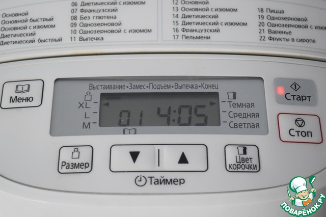 Выбираем "Основной хлеб", размер - XL (у меня это примерно на 700 г муки), цвет корочки - по желанию.