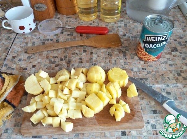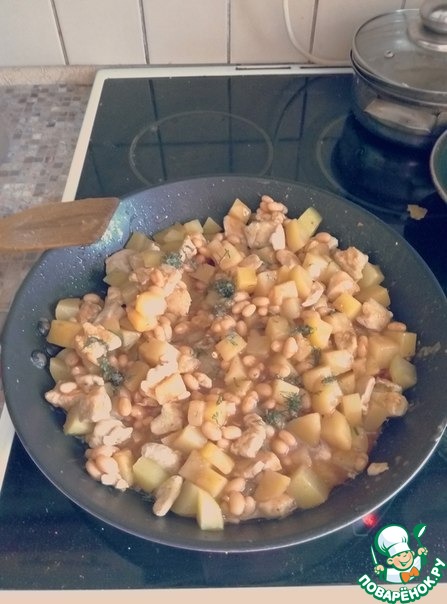 Наш картофель почти дошел до готовности, а это значит, пришла пора добавлять фасоль. Солим, перчим, все хорошенько перемешиваем, чтобы томатный соус покрыл все блюдо, и оставляем на очень маленьком огне тушиться еще 10 минут, иногда помешивая.