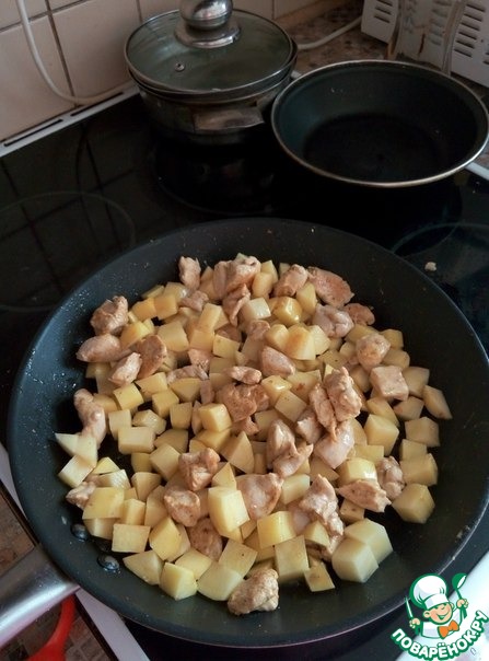 Нарезать филе кубиками и отправить на разогретую сковородку, предварительно смазанную подсолнечным маслом.