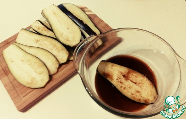 Начнем с баклажан. Нарезать ломтиками вдоль и каждый ломтик окунуть в соевый соус. Таким образом и горечь уйдет, и вкус появится. Оставить на 20 минут. По истечению времени просто откинуть на дуршлаг, промывать не надо.