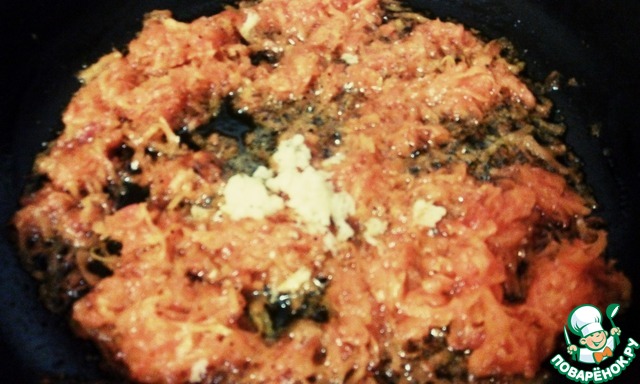 На второй сковороде с подсолнечным маслом пассеруем натертую морковь. В конце добавим соль, перец, чеснок выдавленный через пресс. Это наша вторая начинка.