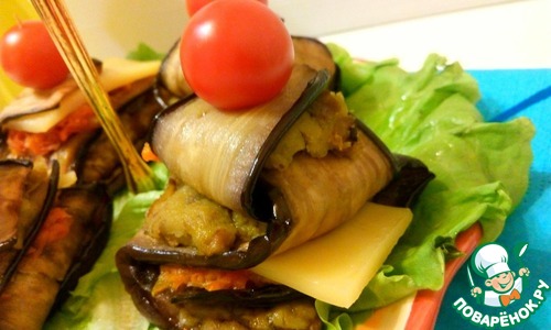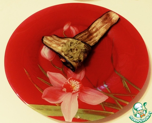 Теперь нижний баклажан завернуть на морковь и положить опять гороховую начинку. Снова накрываем вторым баклажаном и опять начинка из моркови. Надеюсь понятно объяснила.