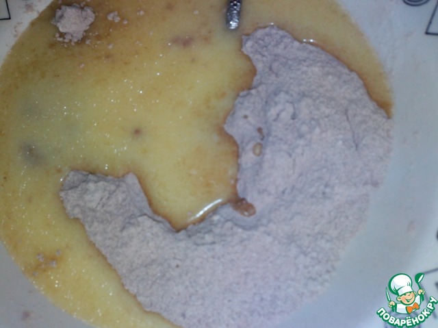 Тщательно перемешать и влить кипяток. Хорошо перемешать венчиком. Вылить тесто в смазанную маслом и присыпанную мукой форму и выпекаем 50 минут.