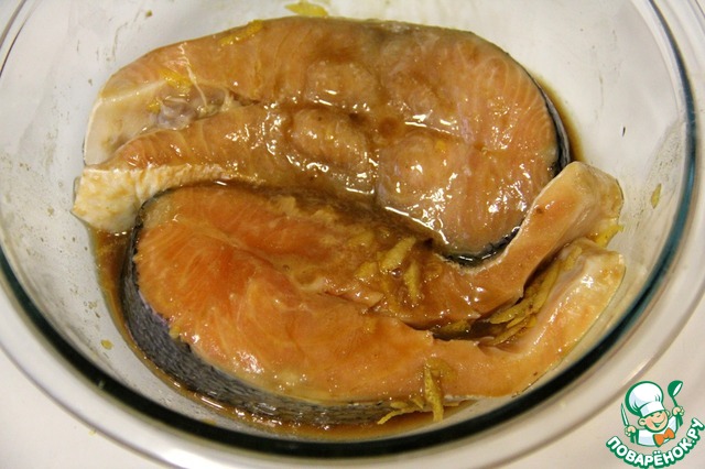Стейки лосося моем, промокаем бумажным полотенцем и кладем в миску. Добавляем соевый соус, имбирно-соевый соус ( или натертый на мелкой терке корень имбиря, примерно 0.5 см), кленовый сироп, лимонный сок и цедру лимона. Перемешиваем и оставляем на 10-15 минут мариноваться.