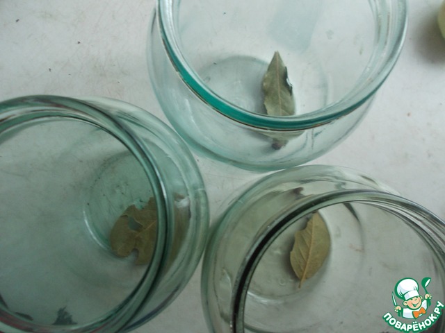 Берем стерилизованные баночки. Внимание! Если вас есть пресс, значит берите литровые, если духовка, значит берите маленькие банки 500 мл. В каждую баночку добавить лавровый лист и по несколько горошин перца.
