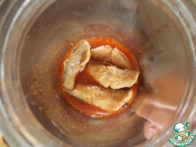 Затем снова соус и снова бычки. Но не под самое горлышко, оставьте немного места. Соуса должно быть много, не смотрите что бычки плавают, после тушения он уже не будет таким жидким, ведь мука из бычков сделает его гуще. Благодаря большому кол-ву соуса, косточки хорошо разварятся.