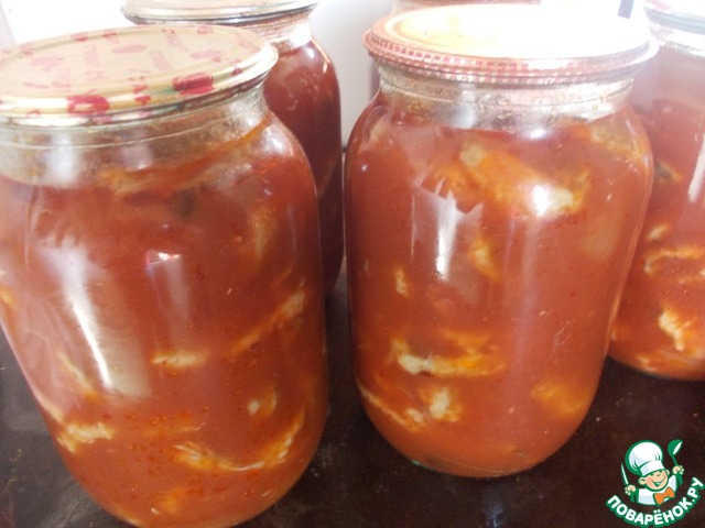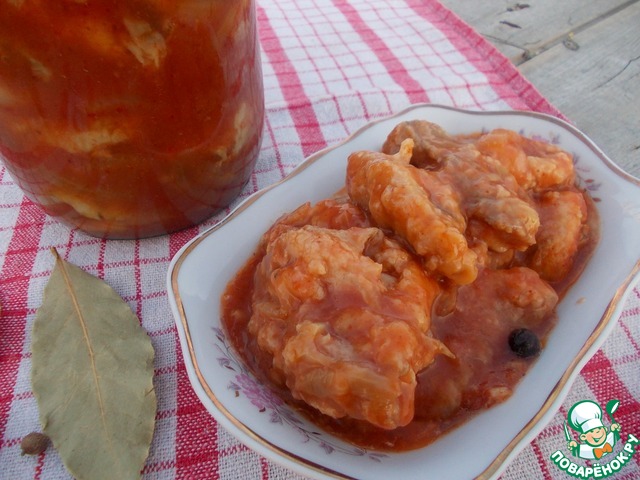 Для духовки немного другой метод. В каждую баночку нужно влить по чайной ложке уксуса 9%. С крышек снять резинки и накрыть, но не закатывать. Поставить в духовку 150 С. и тушить 4 часа.. После одеть резинки и закатать. Утеплить до полного остывания. Хранится такая консерва долго. Вот у меня уже второй год пошел, прекрасно на вкус и на качество. Думаю не нужно обьяснять разницу с магазинной консервой. У меня есть пресс, поэтому готовлю так, а вот мама моя, всегда делала в духовке. Приятного аппетита!