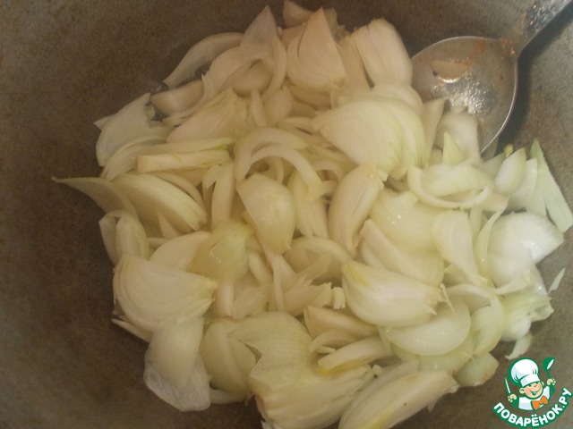 Затем приготовим соус. Это делается довольно быстро, обычный томатный соус. Лук почистить и порезать полукольцами. Так как у нас его много, то возьмем казан, нальем туда масла, не больше стакана и обжарим до мягкости и прозрачности лук. Затем выльем туда воду, томатную пасту, посолим и добавим сахар по вкусу. Пробуйте! Подливка должна быть вкусной, сладковатой, как вам нравится. Довести до кипения, проварить пять минут и выключить огонь.