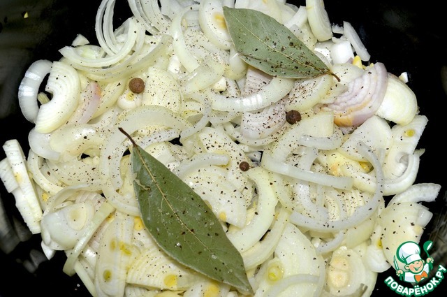 В чашу мультиварки налить 1 ст. л. растительного масла и выложить лук. Посолить, поперчить, добавить душистый перец и лавровый лист и перемешать. Налить 50 мл воды.