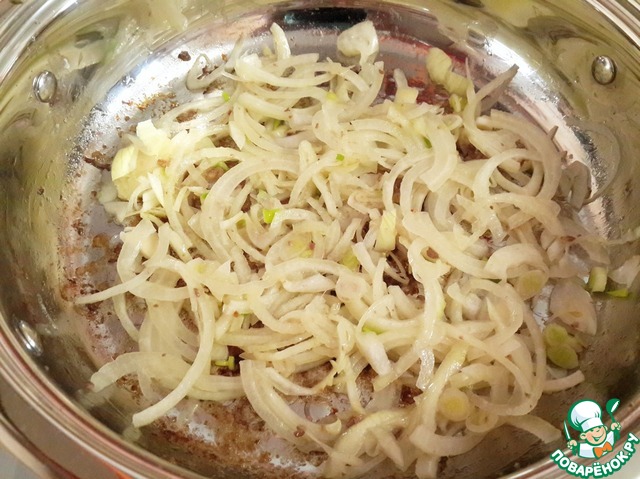 На этом же масле обжарить полукольцами лук, до золотистого цвета.