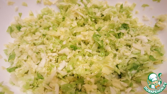 Нашинковать молодую капусту. Немного помять руками до выделения сока.