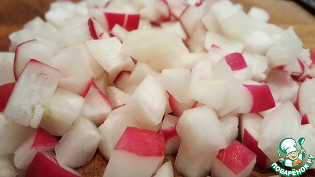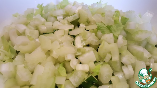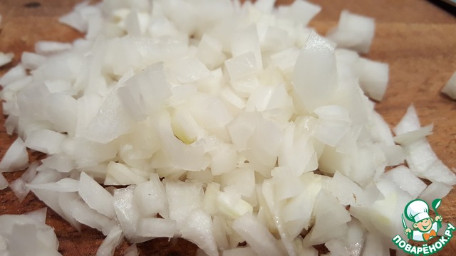 Нарезать мелко белый лук. Если у Вас обычный репчатый лук, положите его в дуршлаг и обдайте кипятком.