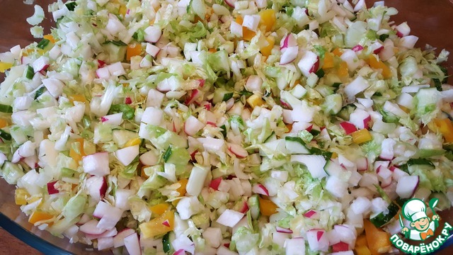 | За что Вы любите весну?! За солнце, капель, пение птиц!!! А ещё за раннюю капусту!!! Так приятно купить ярко зелёный кочанчик весеннего чуда и приготовить, например, салатик!!! Угощайтесь!!! P.S. За совет с заправкой огромное кулинарное и человеческое спасибо Наташеньке (Natapit)!!! |