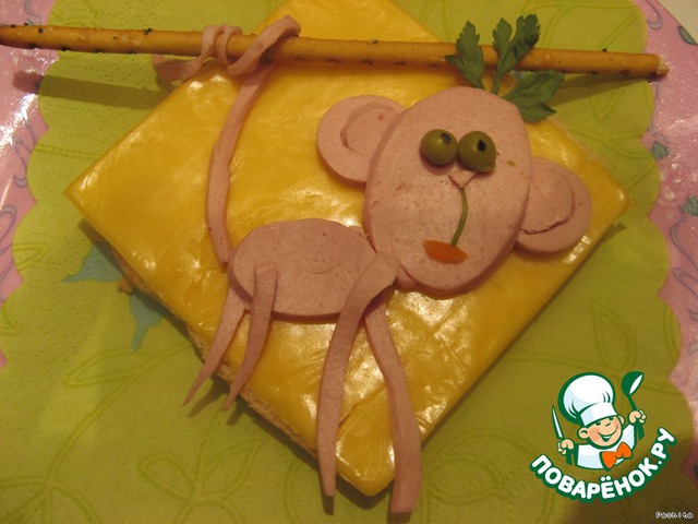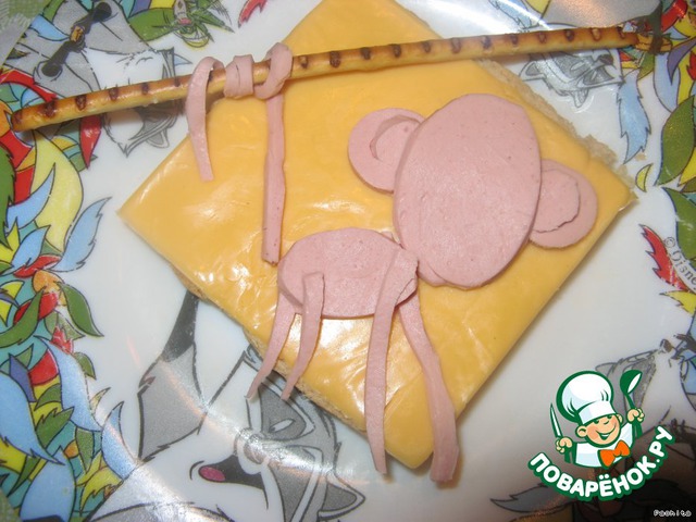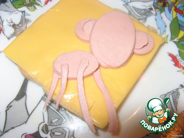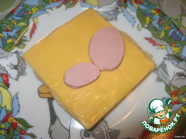 Из колбасы вырезать два овала - это голова и туловище, положить на бутерброд.