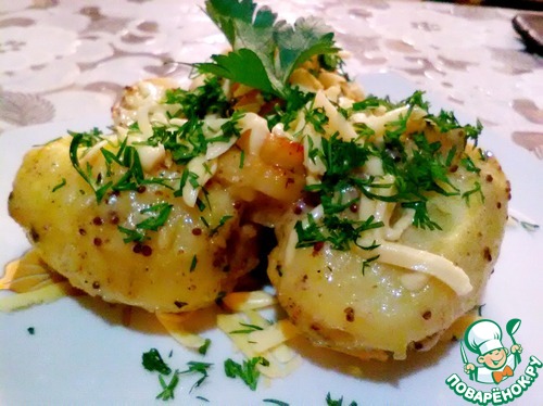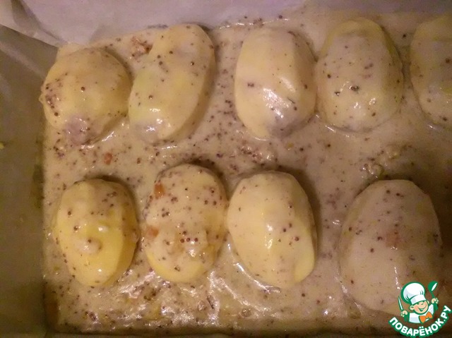 Сверху заливаем соусом-заливкой и отправляем в духовку разогретую до 180 градусов на 40 минут. Каждые 10 минут переворачиваем картофель