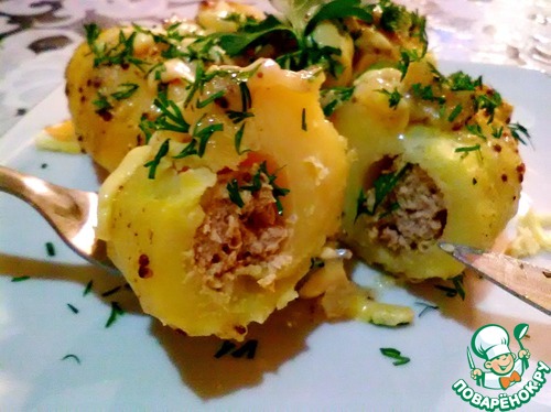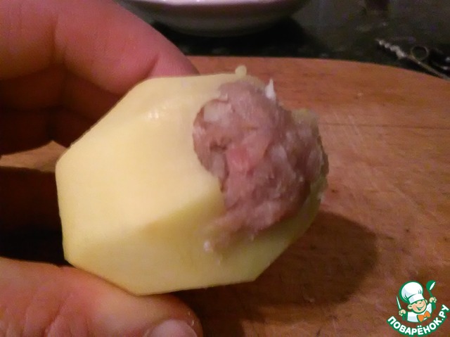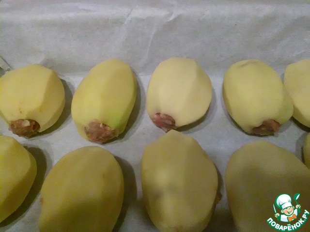В отверстия картофеля добавляем плотно начинку.