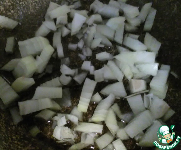 Начинаем делать соус-заливку. Чистим луковицу покрупнее и режем ее крупно. Заливаем масло в сковороду и ставим лук жарить.
