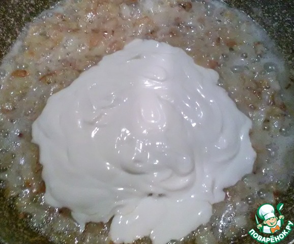 Лук уже прожарился и мы добавляем к нему 2 ложки муки. Перемешиваем, добавляем сметану