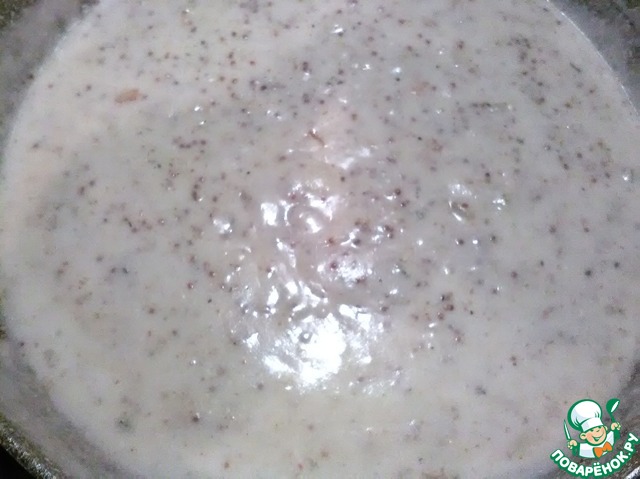 Размешиваем, добавляем воду, специи и соль, а так же горчицу. Снова размешиваем и доводим до кипения. Должен получиться соус консистенцией как жидкая сметана