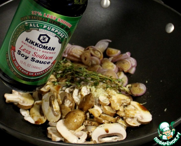 На сковороде нагреть растительное масло, положить нарезанные пластинками грибы, нарезанный полукольцами лук-шалот, тимьян, мелко нарезанный (или измельченный в чеснокодавилке) чеснок, перец и соевый соус. И тушить пока вся влага не испариться.