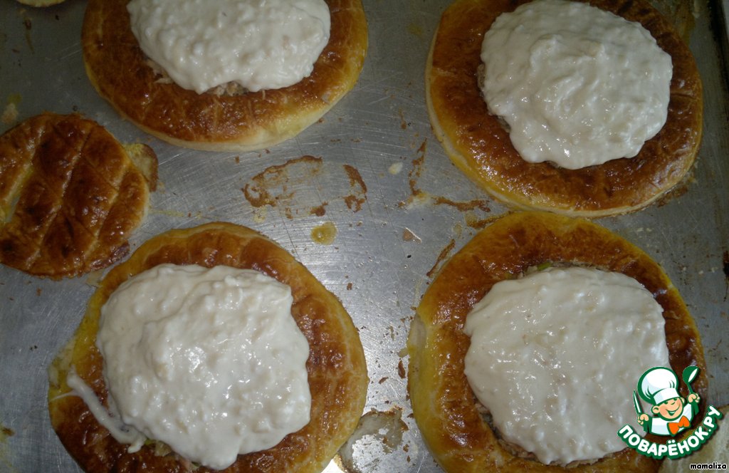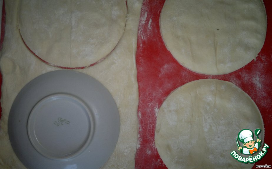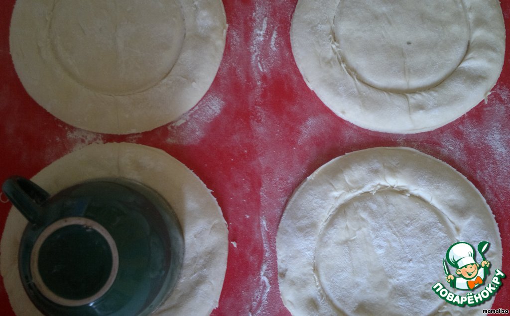 Листы слоеного теста слегка растянуть, вырезать из каждого по 2 круга.