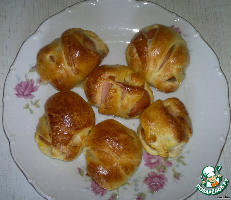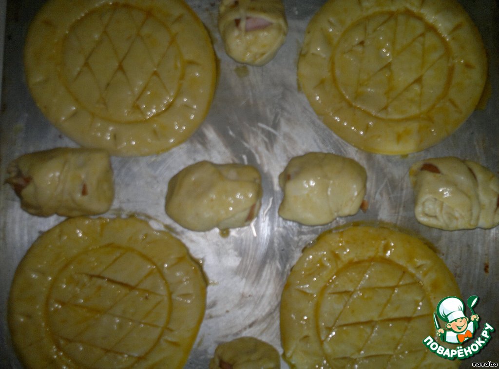 В обрезки теста я завернула сардельки и испекла вместе с тарталетками. Вот побочный продукт нашего рецепта.