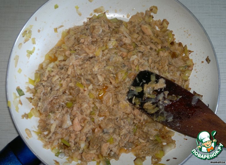 Лук мелко порезать, обжарить до прозрачности на сливочном масле. Добавить мелко порезанную семгу, посолить, поперчить, немного припустить до готовности.