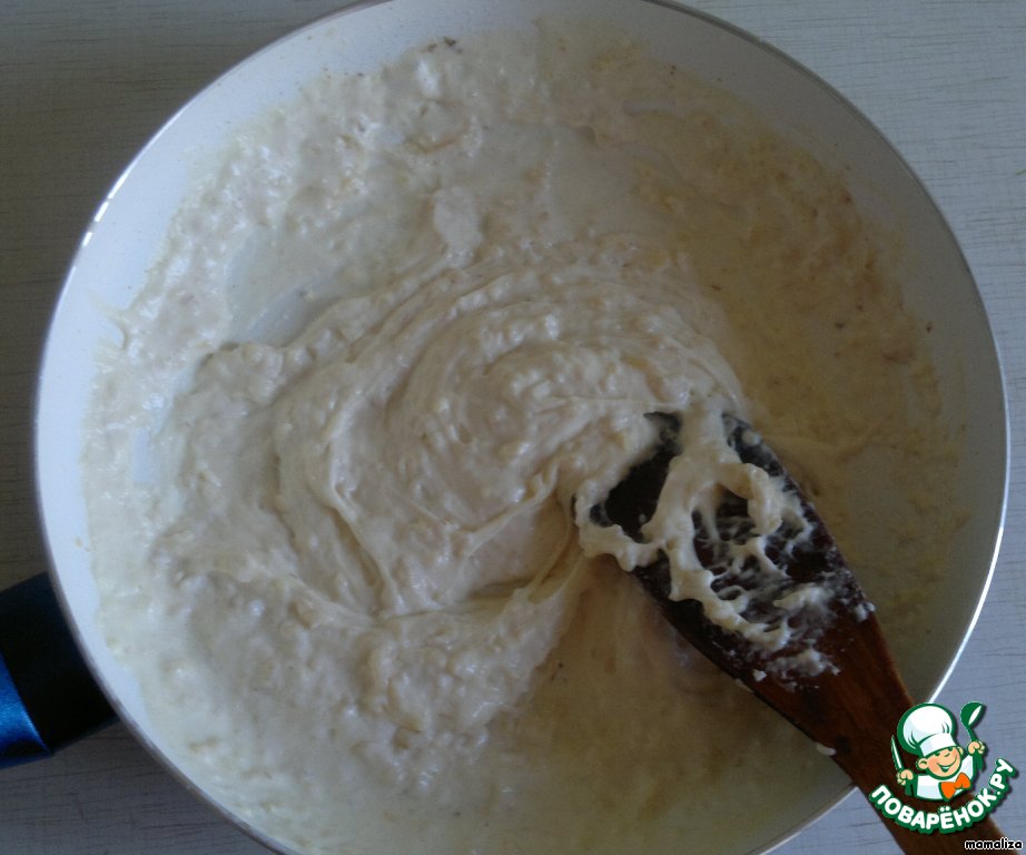 На другой сковороде подсушить муку, добавить 2 ст. л. сливочного масла, тщательно перемешать,, снять с огня. Добавить сливки, перемешать, чтоб не было комков. Опять поставить на огонь, прогреть до загустения. Снять с огня, добавить мелконатертый сыр.