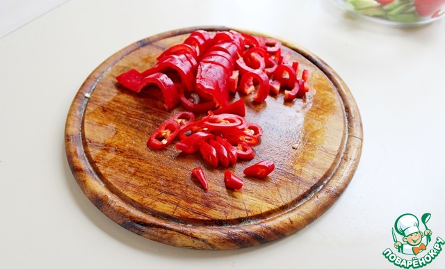 Сладкий перец и перец чили нарезать на тонкие кольца.