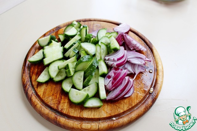 Огурец нарезать небольшими кусочками. Салатный красный лук -перьями.